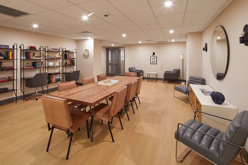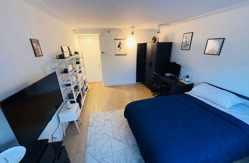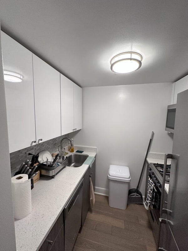 This room in the Midtown East offers a contemporary, light-filled living space with polished wood floors, and an open layout complemented by a modern kitchen; available amenities include a 24-hour doorman, fitness center, lounge and coworking spaces, and laundry facilities, with quick access to Grand Central Terminal, Midtown offices, popular restaurants, and multiple transit options.