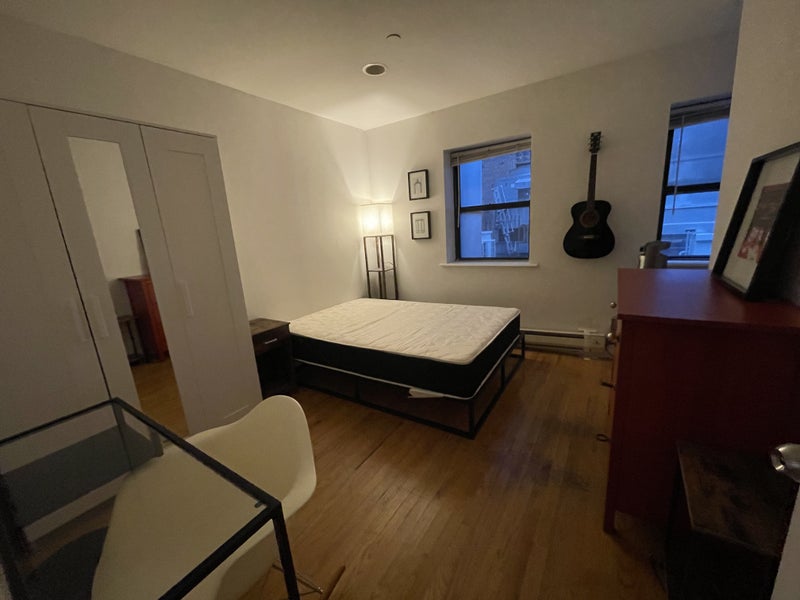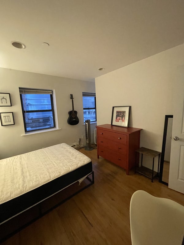 The room is currently furnished with a full size bed and mattress, desk, chair, dresser and wardrobe (see photos). You may bring your own furniture if there’s space, but we cannot remove any of the existing furniture.