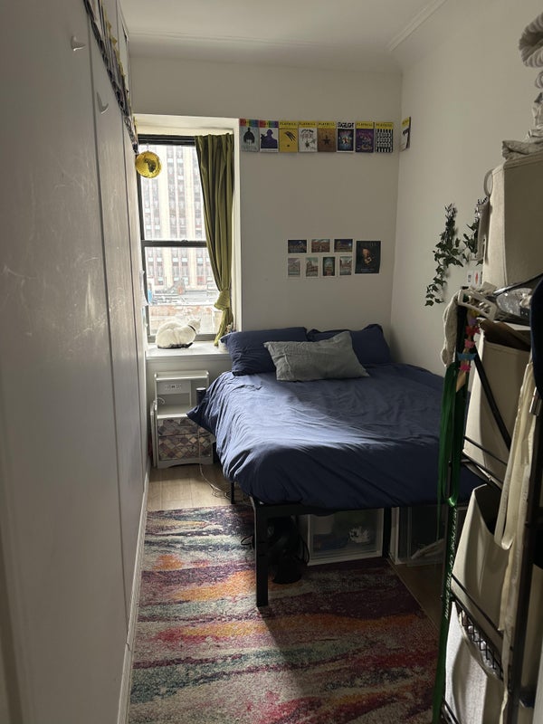 Hi everyone! I'm an actor here in NYC and I got a theatre contract out of town for the summer and looking for someone to sublease my room! Its a private bedroom with. a shared kitchen and bathroom with the other three roommates. There is a cat in the apartment who you are welcome to interact with as much or as little as you'd like. It's fully furnished although you will need to bring you're own bedding. Utilities and wifi usually amount to $30-$60/month. There is a gym, lounge, rooftop, and laundry in the building. Full sized bed.