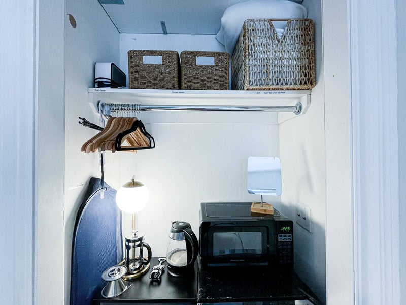 Every room has its own closet with space for clothes, includes a refrigerator, microwave, electric kettle, coffee maker, and has window A/C for the summer and steam heat in the winter. Each room has a desk and chair, a nightstand, a full length mirror, hangers for different types of clothing, a small storage dresser for clothes, shelving, work lamps, a white noise machine, and various other essentials (e. g. portable umbrellas, bottle openers, etc).