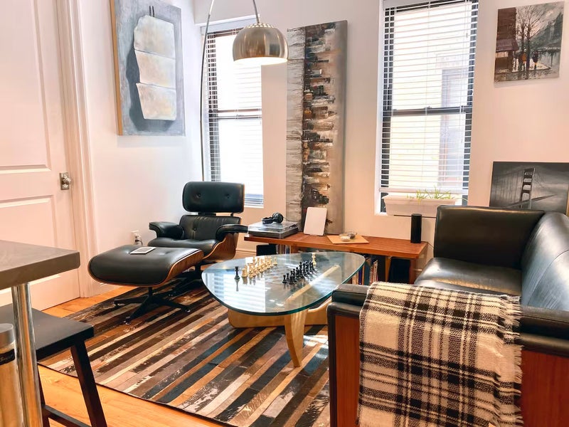 Half the apartment is walled by exposed brick and the floors are all hardwood. The decor style is somewhere between mid-century modern and industrial modern, and is themed by the room.