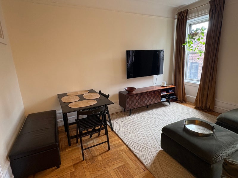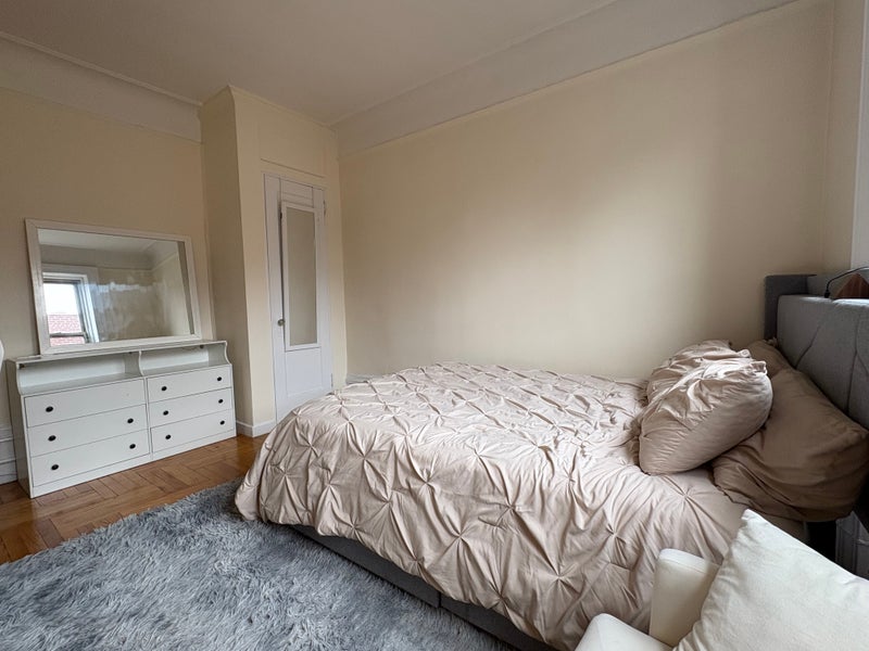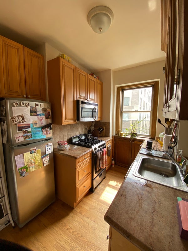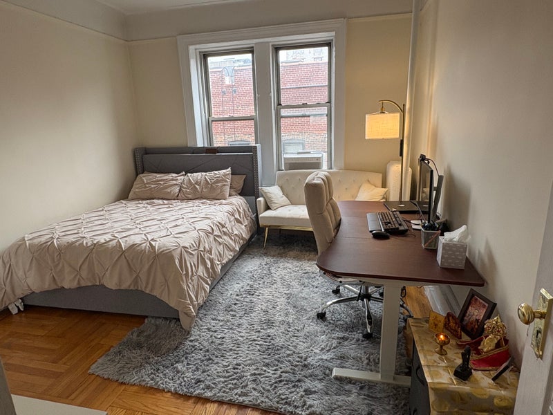 About the Apartment/Space • One bedroom in a shared 2-bedroom apartment • FURNISHED: with an adjustable standing desk, queen bed with mattress and bedding, book shelf, small chest of drawers, file cabinet, A/C unit with remote temperature control • Shared living room, kitchen and bathroom • Light-filled apartment, with view of the Cathedral of St. John the Divine from southeast-facing windows • Kitchen has a dishwasher and pots/pans/gadgets you may use • Laundry in the basement • Elevator accessible • (No roof deck or doorman; also no pets allowed)