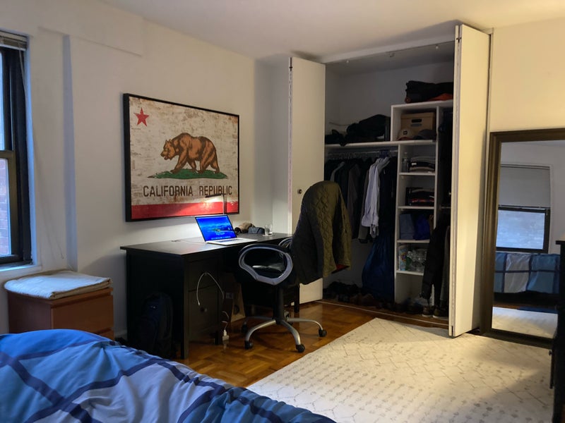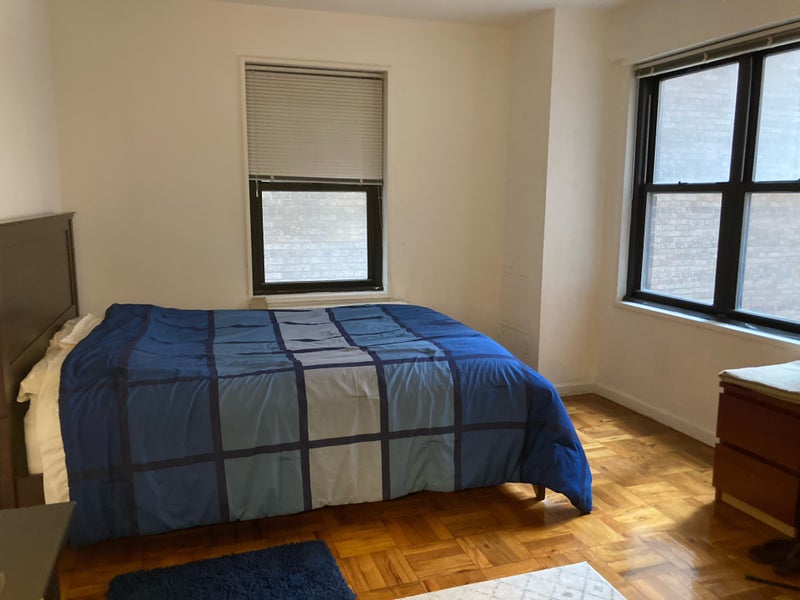 The whole apartment including the bedroom which is one of the real bedrooms is MASSIVE for NYC standards. Monthly rent is $1,945 per month. Tons of room which can easily fit a king sized bed, a desk, dresser, even a small sofa. It has an AC/heating unit in it. Unfurnished. Two windows.
