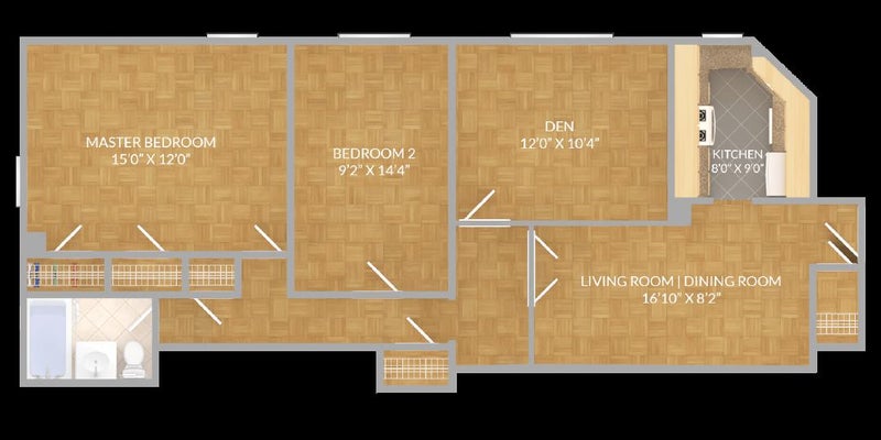 Apartment and building: ? 960 sq ft apartment ? Room 1 is 12' by 10'4; Master room is 12' by 15' ? Both rooms have built-in closet ? Additional closets available in the hallway ? Elevator building ? Laundry room in the building