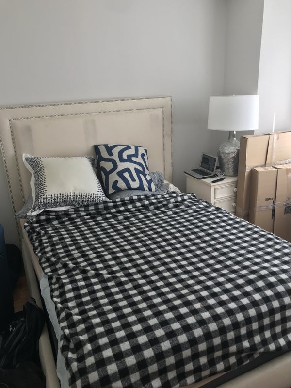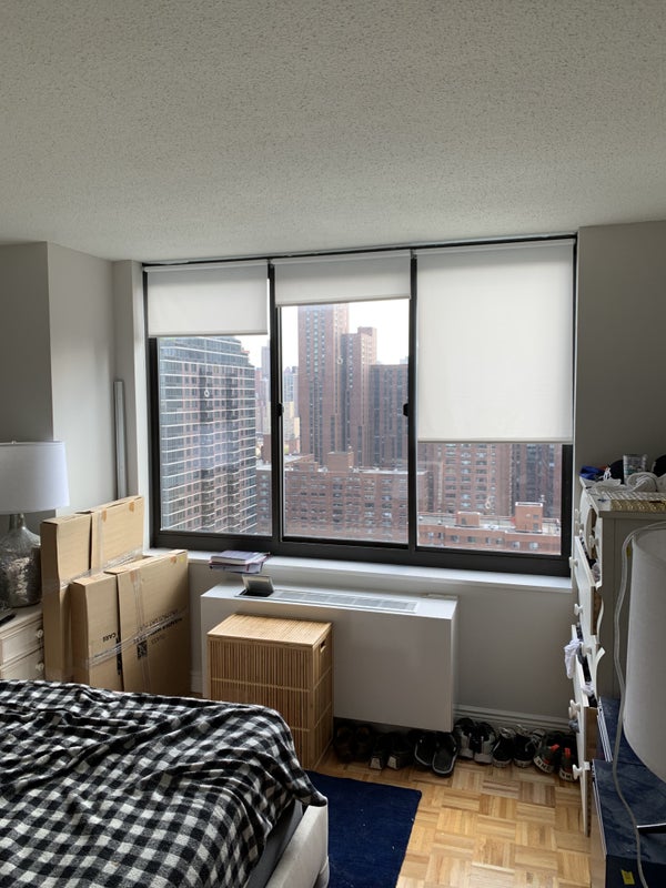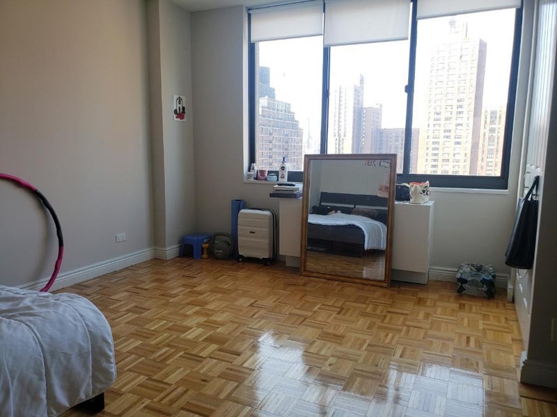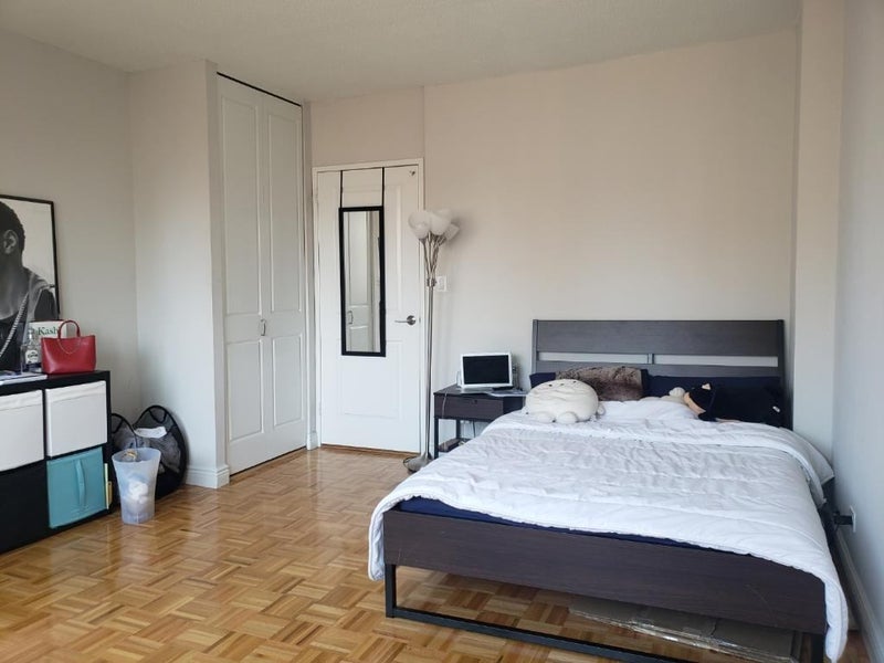 The apartment is on the 26th floor of the building, and is a 2 bed 1.5 bath flexed to 3 bed. I am in the second room, and the flex room and master bedroom are up for grabs. The master bedroom can fit a king size bed with dressers, it has plenty of space. The rent for it will be $1610. The flex room can fit a queen size bed with bedside drawers and dresser. The rent for it will be $1490.