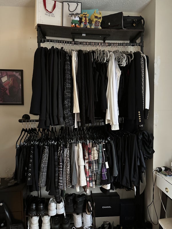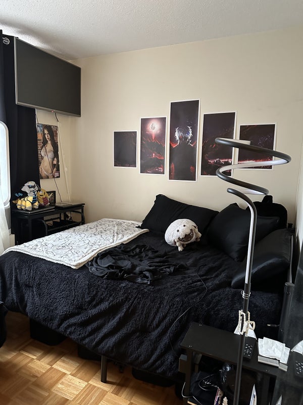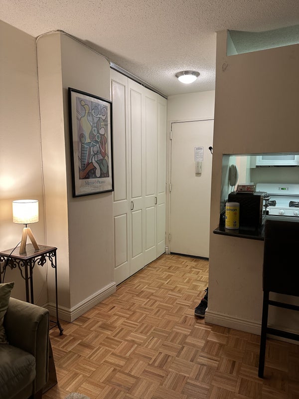 Personal closet located in the hallway which would be entirely yours, plus an in the wall 2 level clothes rack in the room. Current roommate is open to leaving his bureau, table and tv mounted on the wall.