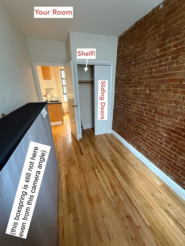The bedroom and common spaces were recently renovated, and feature exposed brick walls and track lighting. Every room has a window that lets in lots of natural light. The windows in the room face the street, so you don't have the cramped experience of looking out at another building a few feet away.