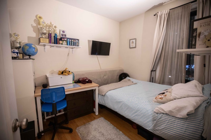 The room is comfortable and functional, and the apartment itself offers a much larger living experience, with a spacious living and dining area.