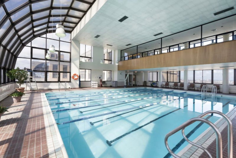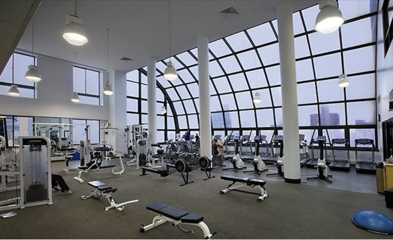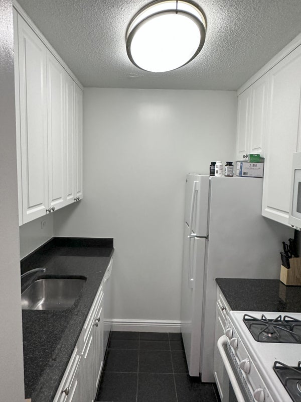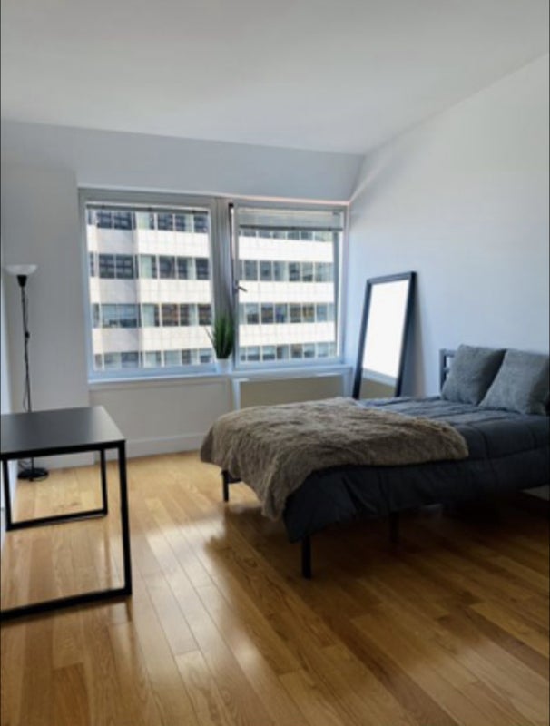 This Upper East Side room offers a cozy living space with hardwood floors and a modern kitchen equipped with stainless steel appliances. The building features amenities like a 24-hour doorman, fitness center, indoor pool, on-site laundry, and a resident lounge.