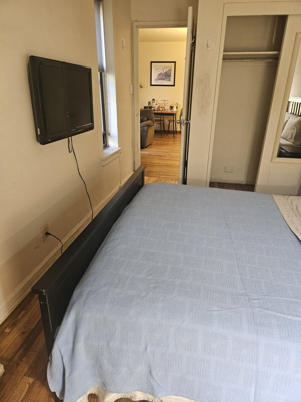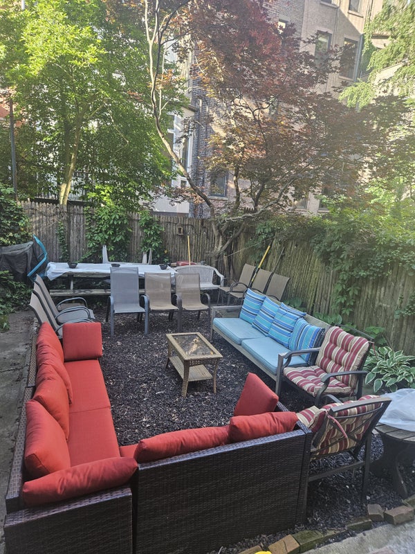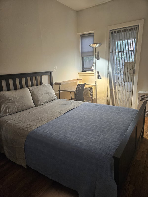 The furnished bedroom is good NY City size(13X9) with a large closet. Very sunny with direct access to our giant, two level back yard(20X50) that we have all to ourselves!! **There is another door to the backyard from the spare room downstairs.