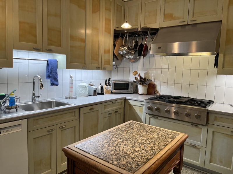 Corner apartment has 3 exposures and multiple living/library rooms that are shared. 500 sq ft. eat in chef's kitchen.