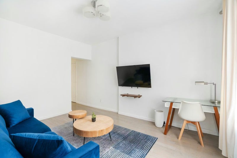 Enjoy relaxing in the cozy living area with a 50" smart TV, or catch up on work at the convenient desk space.