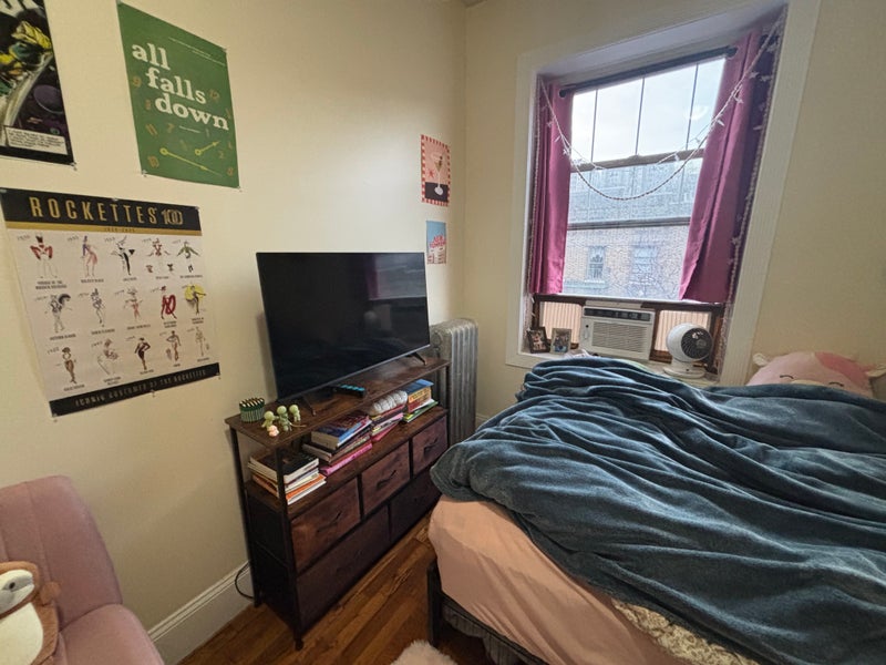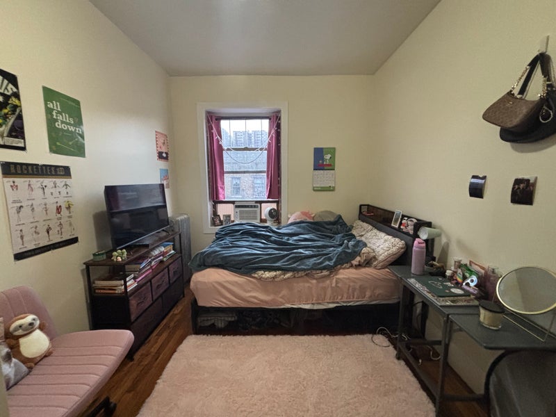 Hello! I’m looking for someone to sublease my room for a few months starting April 1-June 26th(flexible move out date). The room is spacious, fully furnished with plenty of closet and storage space, with a AC unit and tv in the room! The apartment is fully furnished with laundry in building and all utilities except electric are included! It’s a 6-8 minute walk from the express A train and 1 train. My roommate is really dope, lgbt and smoke friendly as well!