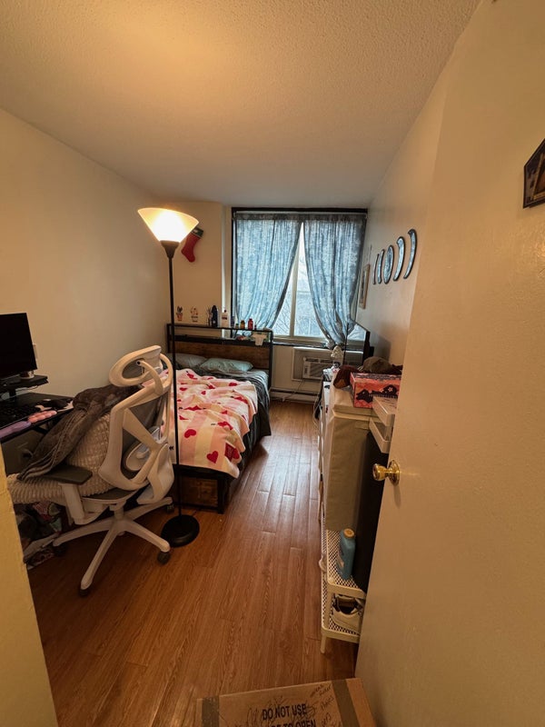 The room • Good-sized bedroom (fits full or queen bed, dressers, bookshelves) • Large closet with two top shelves • Window AC spot (window unit) — room is otherwise unfurnished • Current roommate may sell her newly purchased full-size bed to the new tenant