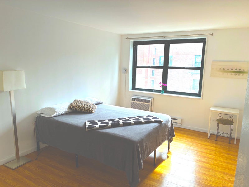 The bedroom is lightly furnished with a queen bed/frame, and a lamp. There's a 6 foot long closet, an air conditioner and individual heat controls.