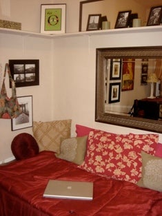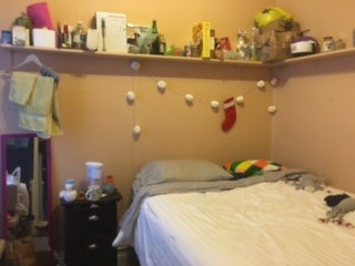 Must be okay with stairs. Upside is sunlight and some views of sky. Room comes with a bed, wardrobe, another closet in the common area, built-in shelves, side table.