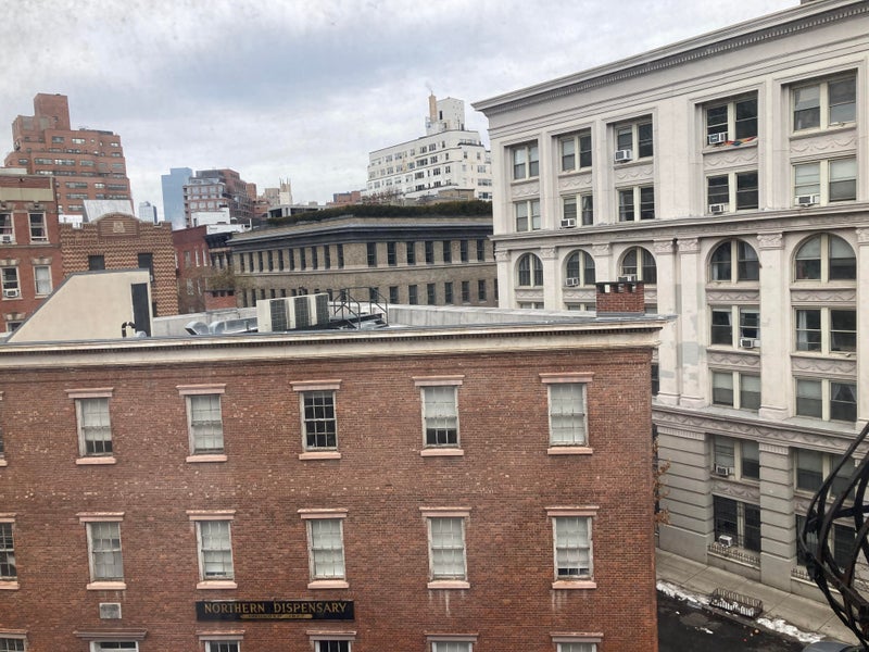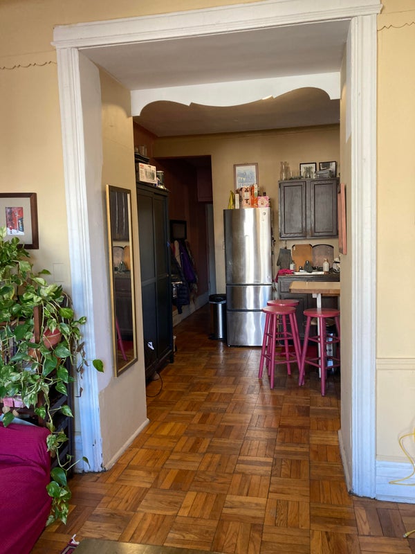 Must be okay with stairs. Upside is sunlight and some views of sky. Room comes with a bed, wardrobe, another closet in the common area, built-in shelves, side table. Southern exposure. Quiet side of the apartment.