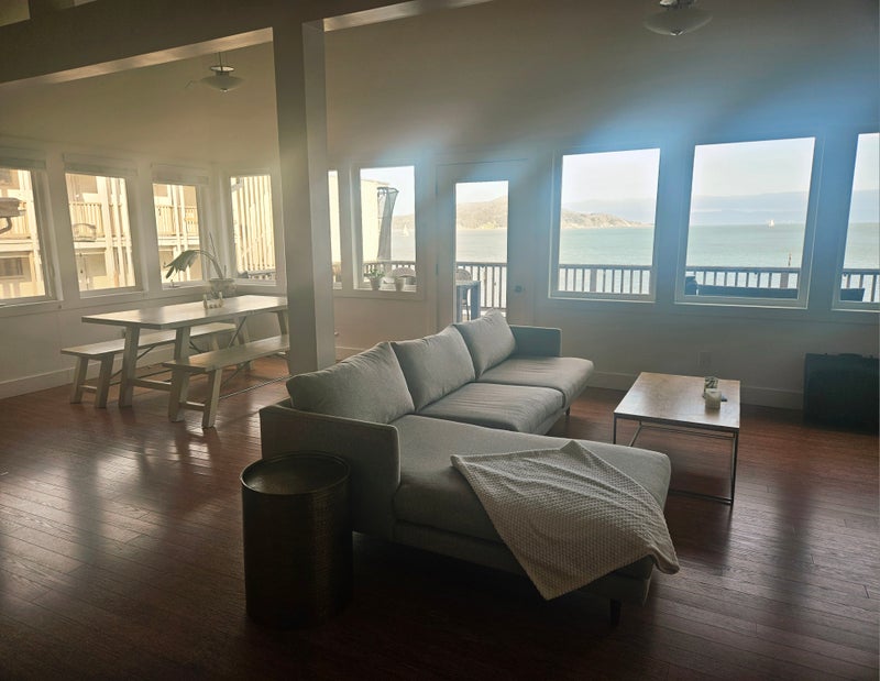 The Home This light-filled home features an open floor plan, hardwood flooring, and expansive windows. The kitchen is equipped with modern appliances. An in-unit washer and dryer adds convenience and ease. The large deck offers sweeping views of Angel Island, Alcatraz Island, and the San Francisco–Oakland Bay Bridge, as well as beach access. Shared spaces are clean, comfortable, and thoughtfully maintained.