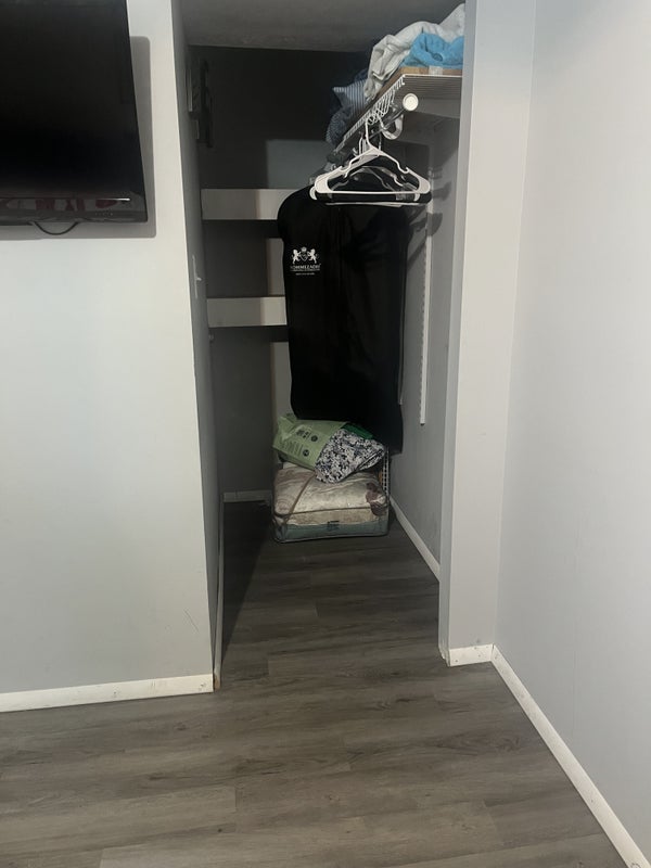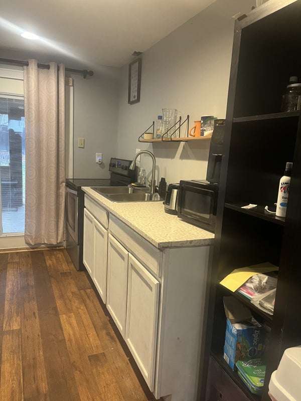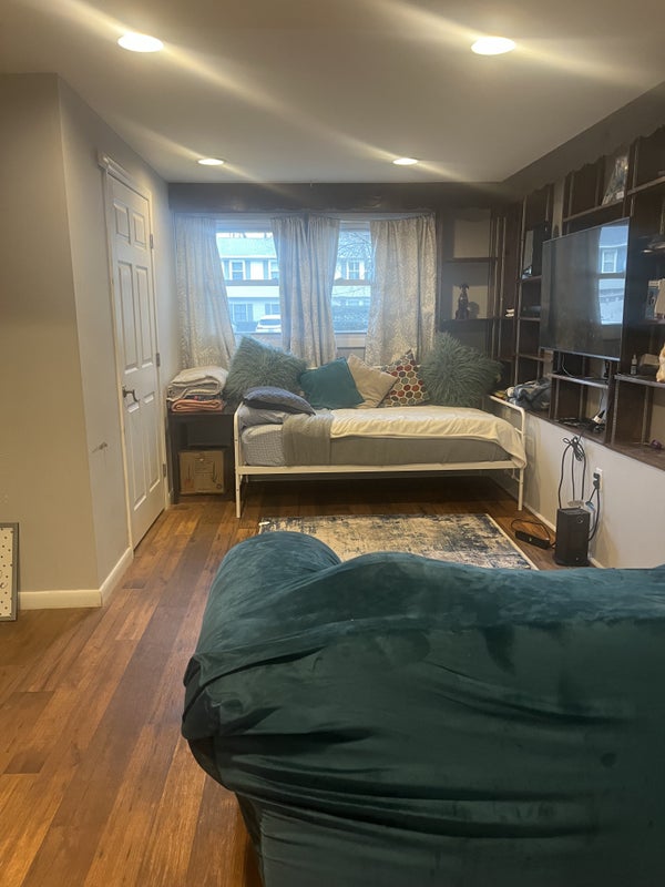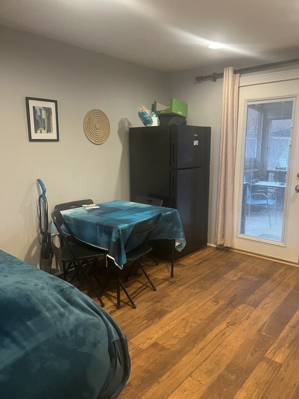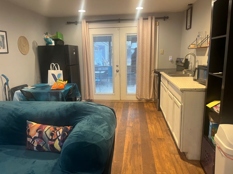 Family living upstairs, husband, wife, child and two dogs. Downstairs one bedroom, bathroom, den, small kitchen and dining area.