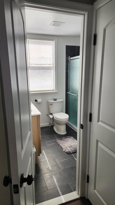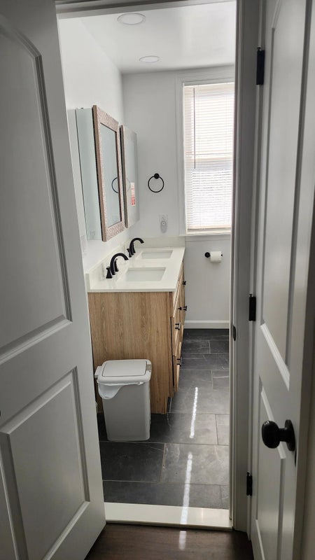 INFO ABOUT THE BATHROOM in vanity with double sink, new medicine cabinets with mirrors toilet with bidet big shower with rain shower head shower glass doors exhaust fan and ceiling lights