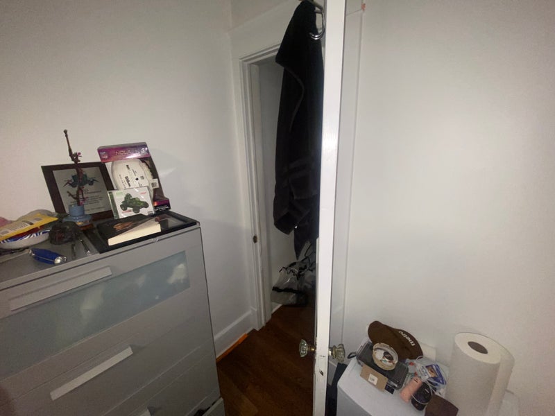 You’d get the **largest bedroom**, complete with a **walk-in closet**, radiator, and window AC. The house has a shared living and dining room, a kitchen with a gas stove and dishwasher, basement laundry, 1.5 baths, and street parking plus a spot in the back.