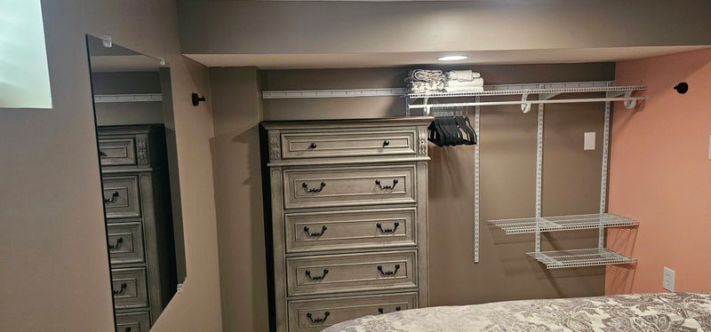 New build room with Ashley Queen bedroom suit. Mattress is heavenly firm but soft. A wall closet, and Ashley bureau. Perfect for an individual who likes their space soft and comfortable. It comes with a shared bathroom and a luxury lounging living room with steps away from the washer and dryer room.