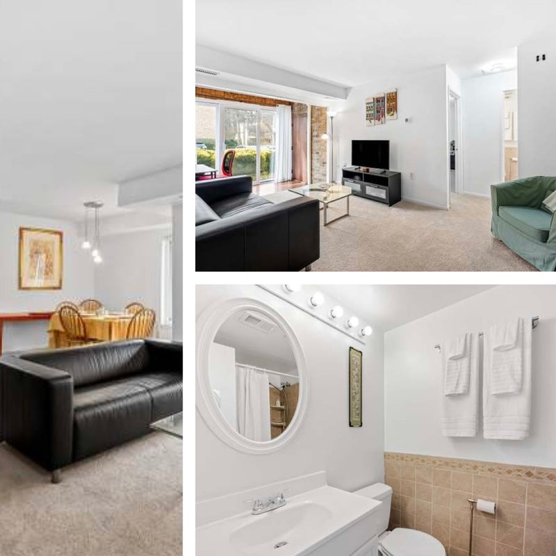 Combination living room dining room, bonus office/den, office space leads to exterior garden space. Potential for patio with condo board approval. No steps and easy access from your assigned parking