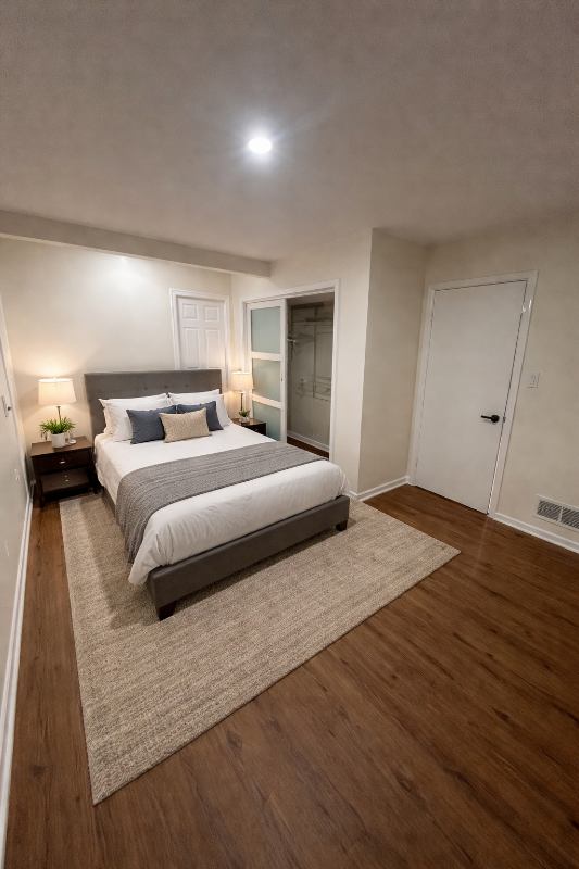 The bedroom is exceptionally large, with new flooring, outlets, and a custom closet system. There’s more than enough space for a kingsize bed, a workfromhome setup, and additional furniture without the room feeling crowded.