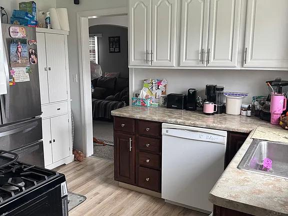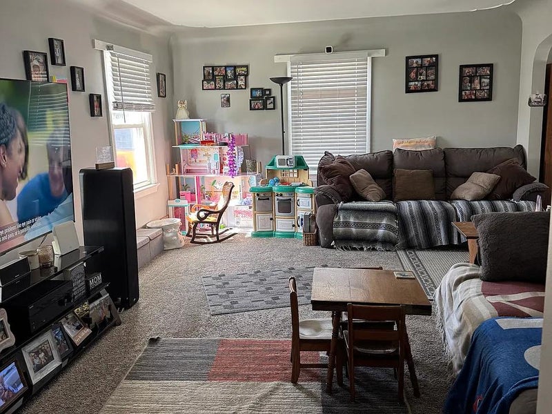 Private, fully furnished bedroom available in a shared home. The room features two windows, a good-sized closet, and access to a shared bathroom. Common areas include a comfortable living room, dining area, and a fully equipped kitchen with dishes, cookware, plates, and more.