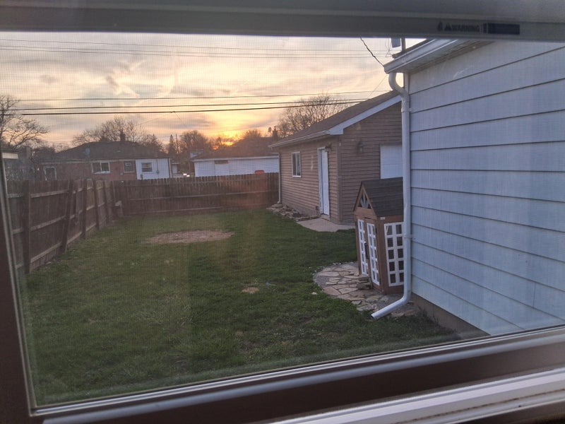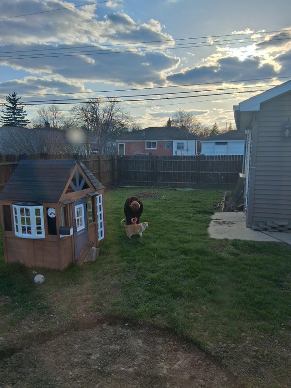 Shared spaces include a bathroom, living room, and kitchen. The home has a fenced backyard (with a small gap in one corner) and a generally peaceful, low-traffic environment.