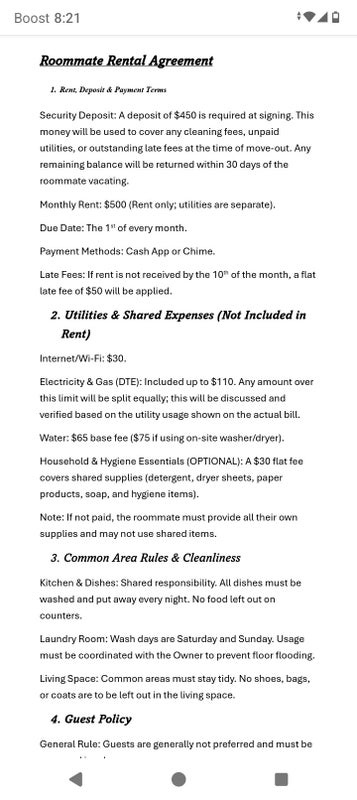 Security Deposit: A deposit of $450 is required at signing. This money will be used to cover any cleaning fees, unpaid utilities, or outstanding late fees at the time of move-out. Any remaining balance will be returned within 30 days of the roommate vacating.