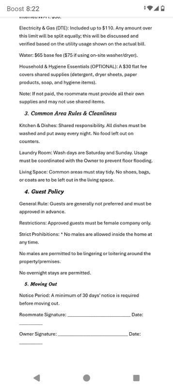 Occupancy Limits: Approved visits must not be on a constant basis. If a guest is present often enough to feel like an additional occupant, it is a violation of this agreement. The home is for the contracted roommates only.