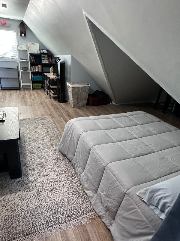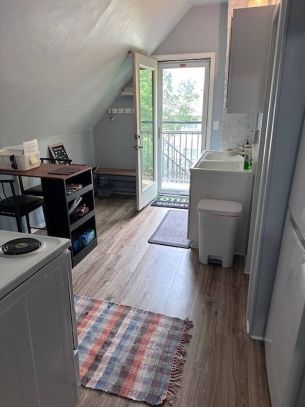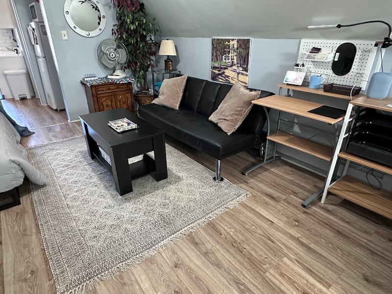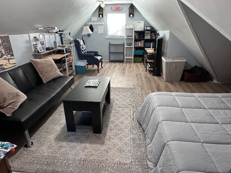 Fully furnished loft on top floor of duplex. Modern furniture, new fridge, stove, air conditioner, bed. Private back entrance. Google doorbell. A full bed plus futon folds into a bed as well if you have a guest. No dogs or cats in this unit. Heat, water, garbage, electricity, garbage and free washerdryer and internet use is included. The option to add on garage for an additional cost.