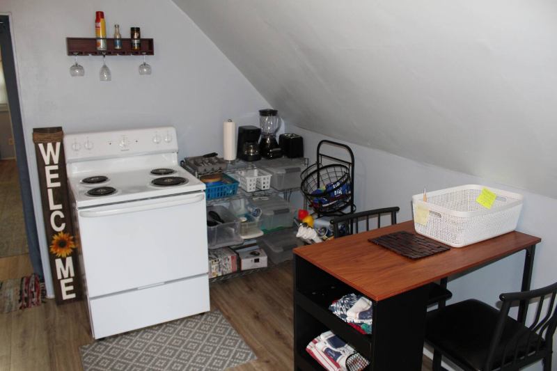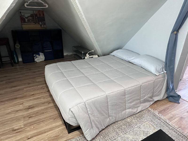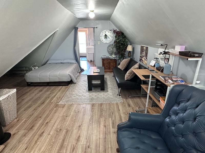 Fully furnished loft on top floor of duplex. Modern furniture, new fridge, stove, air conditioner, bed. Private back entrance. Google doorbell. A full bed plus futon folds into a bed as well if you have a guest. No dogs or cats in this unit. Heat, water, garbage, electricity, garbage and free washerdryer and internet use is included. The option to add on garage for an additional cost.