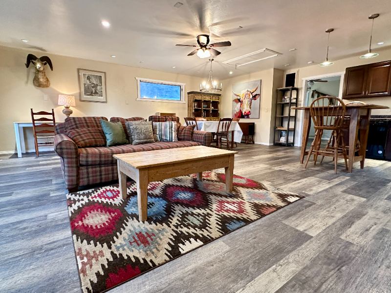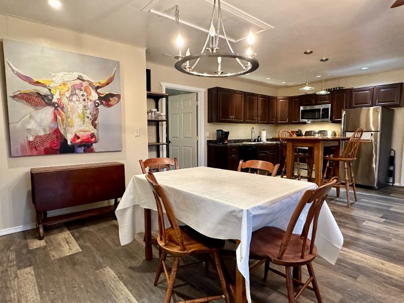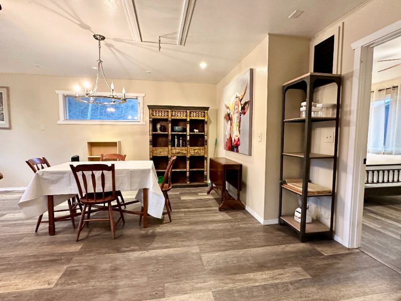 Available for a year lease, and Movein Ready! Featuring bedroom, bathroom, full kitchen & comfortable living space. It's furnished with a bed, couch, Roku TV, tables & chairs, dishes & utensils.