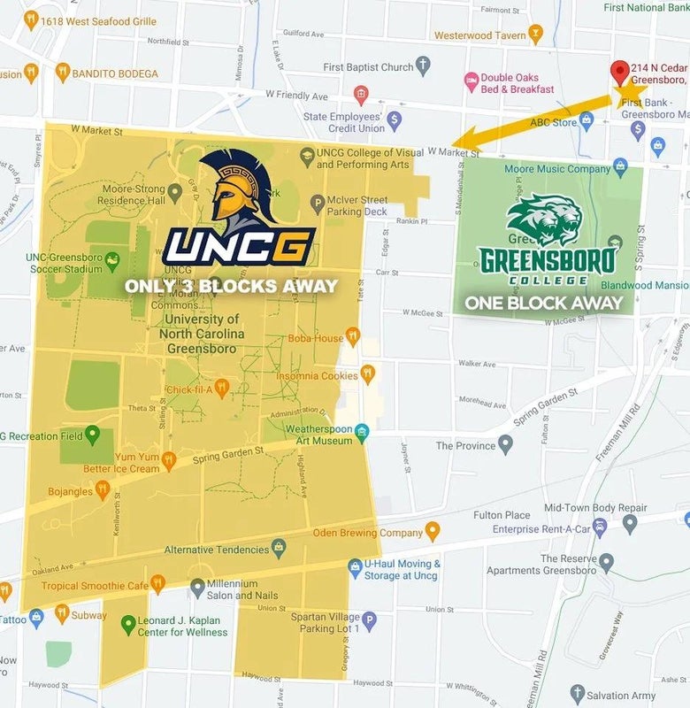 LOCATION & CONVENIENCE Close to Downtown Greensboro () Blocks to Greensboro College () Blocks to UNCG (University of North Carolina Greensboro) Right on the Bus Line () Block to Greenway Loop Convenient to Greensboro Grasshoppers, Restaurants, Breweries, Coffee Shops, YMCA, Entertainment, ABC Store, Westerwood Tavern, Parks, Banks, and more