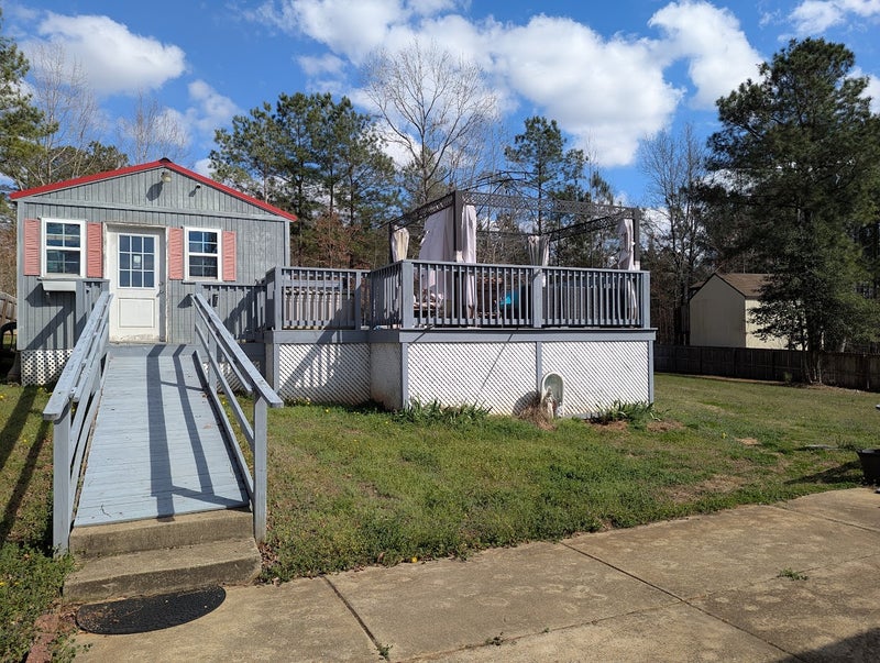 Outdoor spaces include a covered front porch, large back deck, fenced yard, and garden area. One driveway parking space is included.