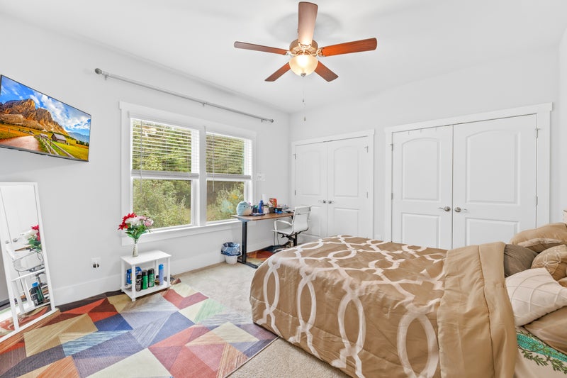 MASTER BEDROOM • Comfy King-sized bed • Smart TV • Side tables and lamps • Ceiling Fan • Smart Standing Desk - 55 inch (big size) • En suite Bathroom • Smart door lock • Walk-in closet