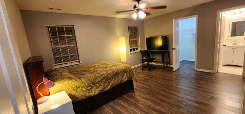 Large Fully Firnished Private Master Bedroom Suite with Prvate Bathroom and walk-closet for Rent to working professional. Including all utilities, High-Speed Wired and Wi-Fi Internet, Laundry Room, large fully equipped Kitchen, Dining, Living Room and Private Deck.