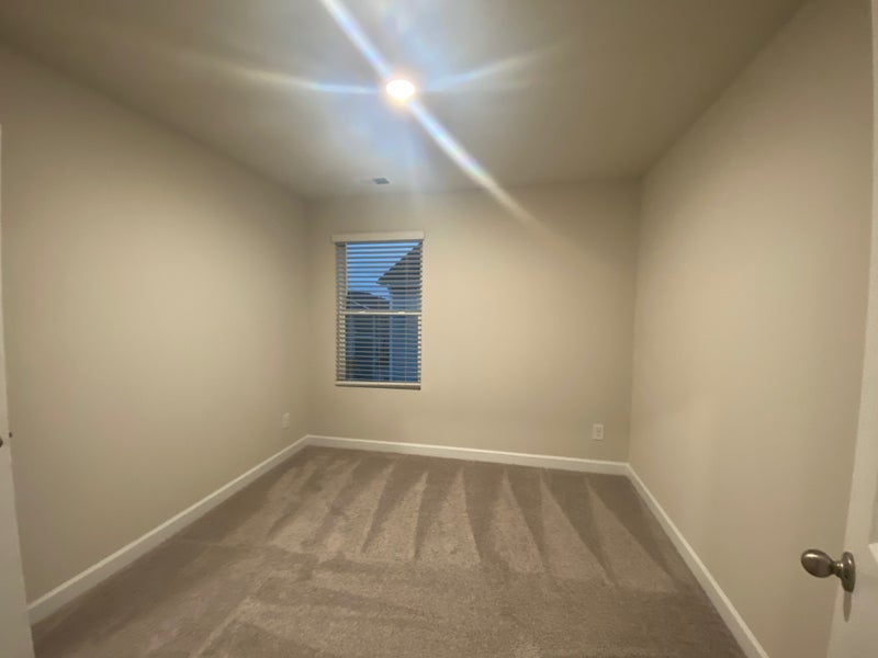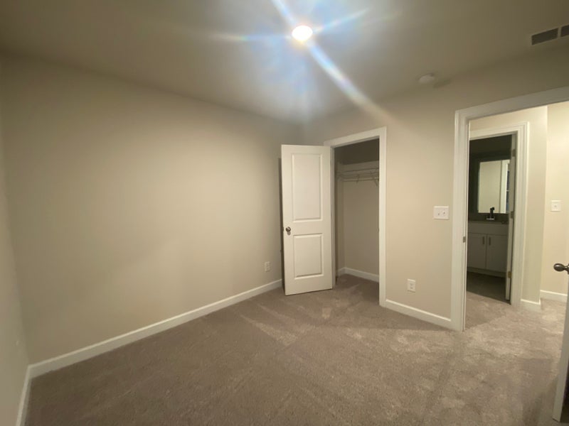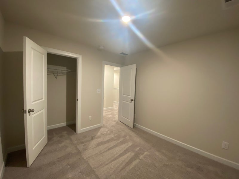 Linen cabinets, smoky grey granite countertops, grey cool tone EVP flooring, and textured carpet.