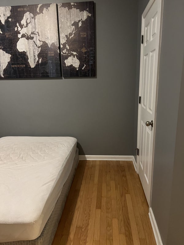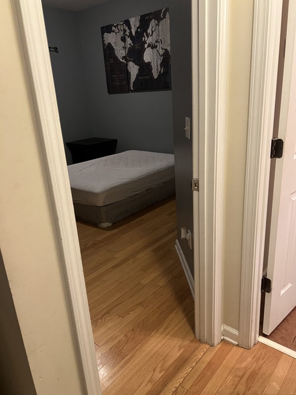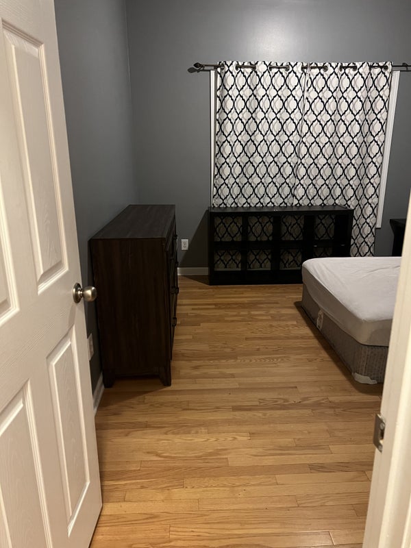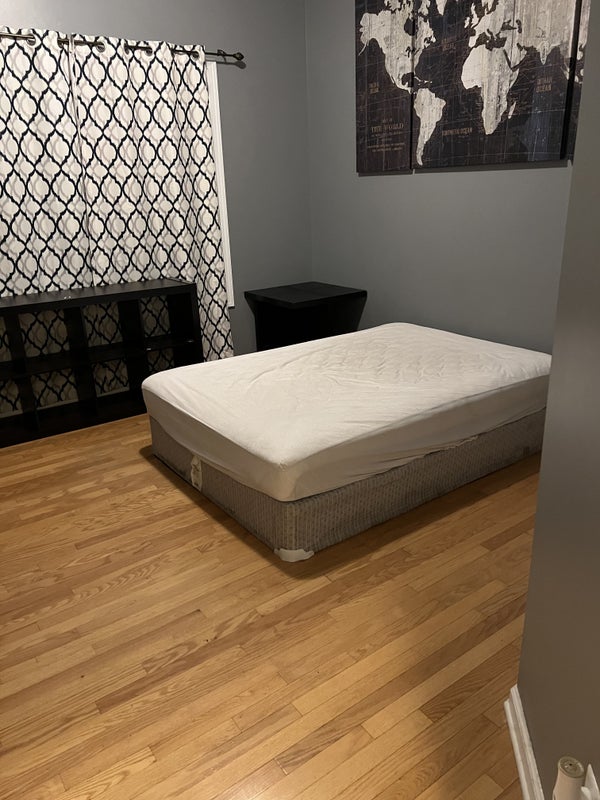 The bedroom is 11' X 11' in a two story 5 bedroom house. It has oak hardwood floors, a double window and good closet size. The bedroom is furnished, but can also be an empty room if needed or modified a needed. It is the only bedroom on the 1st floor and the bathroom is in the hallway right next to the bedroom. The bathroom is used, but the shower is not used by anyone else. The bathroom cleaning is included in the rent.