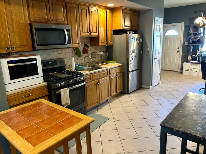 The kitchen and living room are furnished and shared, and the apartment is kept organized and comfortable.