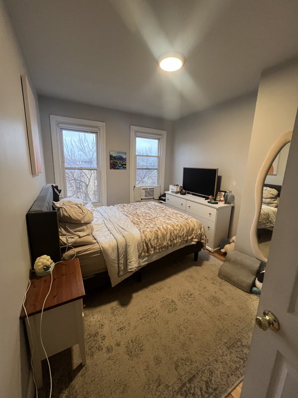 Primary room in Jersey City's Bergen-Lafayette neighborhood, steps to major transportation to Manhattan or turnpike for driving in NJ. Free street parking and 5 min walk to restaurants, coffee shops, and Liberty State Park