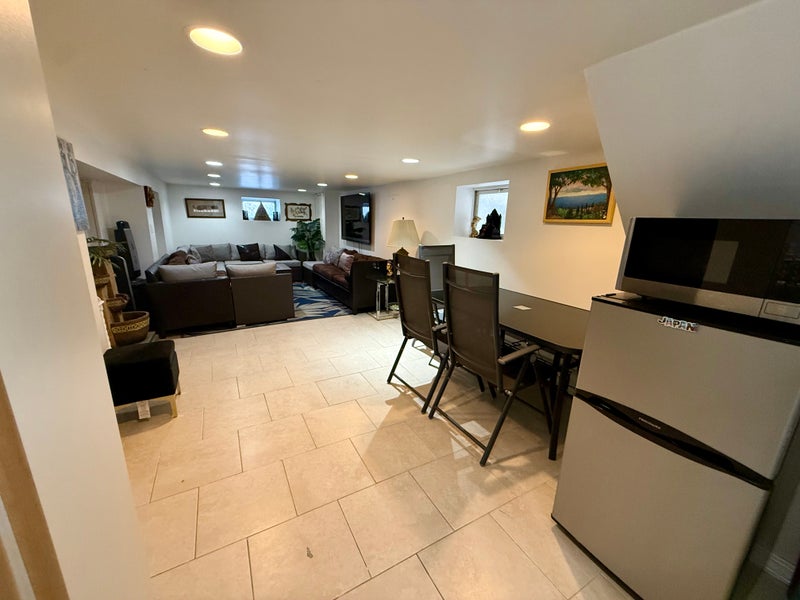 There is a fully furnished living room in the basement having comfortable couches, large tv, dining table, fridge, microwave, laundry room, individial shoe racks to be commonly shared by all the three tenants.