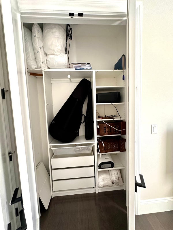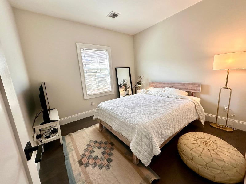 Furnished bedroom with Queen bed, side tables, TV, and TV stand. Features a large closet with organizers.
