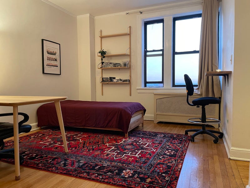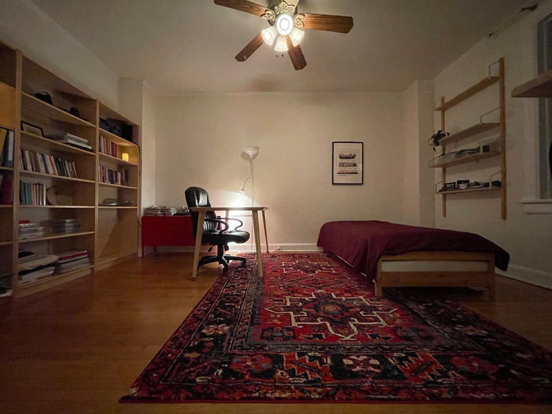 The master bedroom has large windows that take in lots of natural sunlight- blackout curtains are installed as well. A large walk-in closet, a library wall, and a coffee bar/ floating desk, ceiling fan and dimmable light, and A/C's available for the summer.