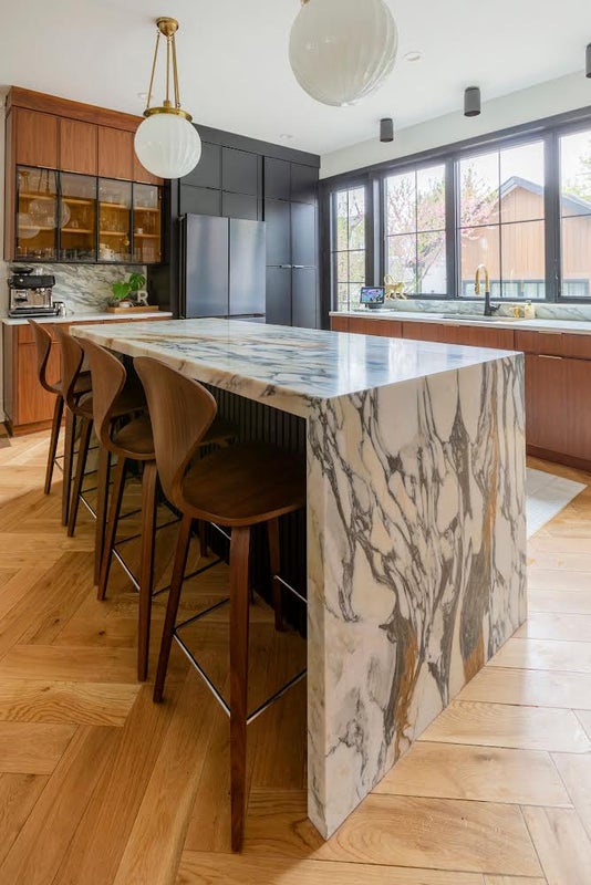 The kitchen is the crown jewel of the home with a large marble waterfall island, 48" executive stove, smart fridge and even a cappuccino maker.