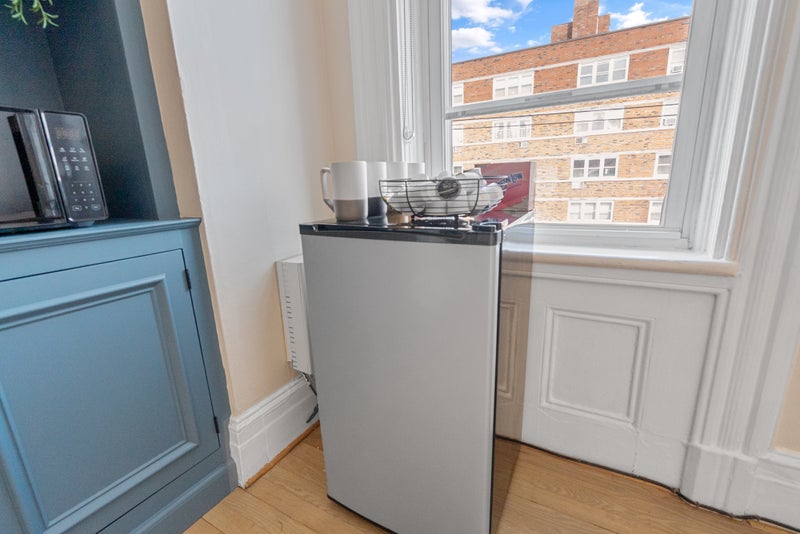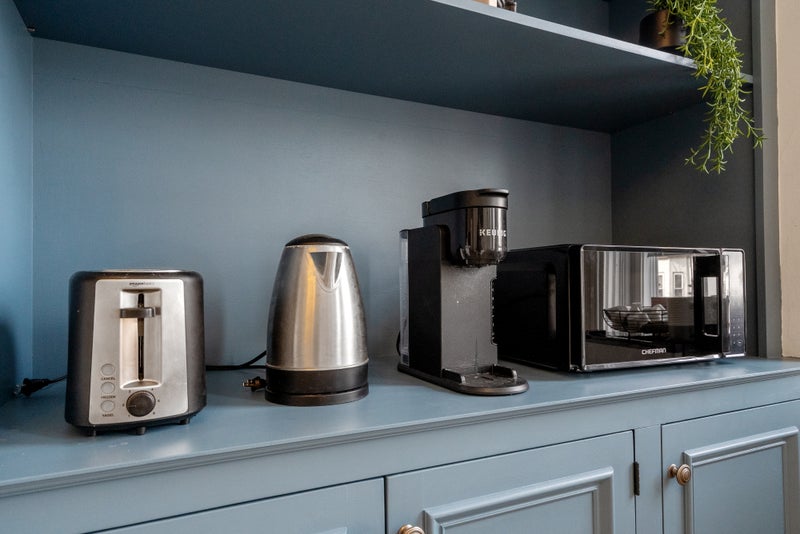 Kitchenette with microwave, mini-fridge, Keurig, and tea kettle