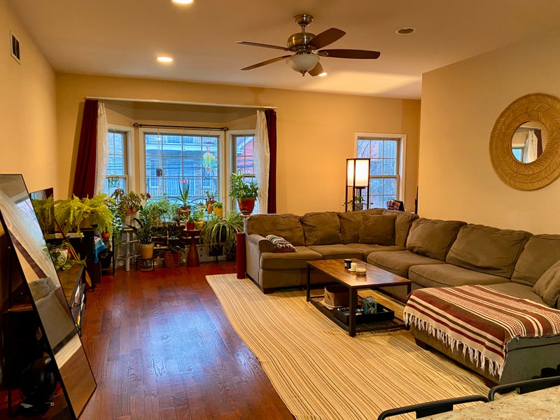 1250 sq ft Second floor with big bay windows and lots of thriving plants Washer/dryer in unit Central air and heat Hardwood floors throughout Shared backyard Basement storage