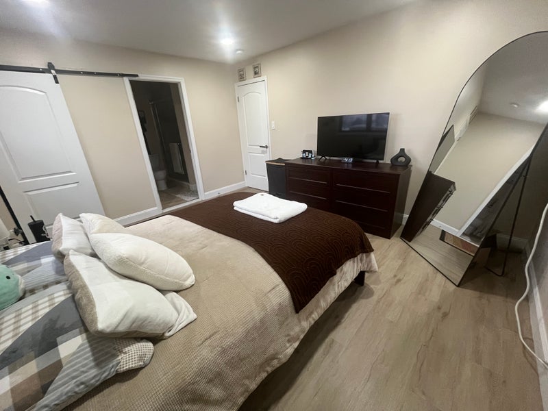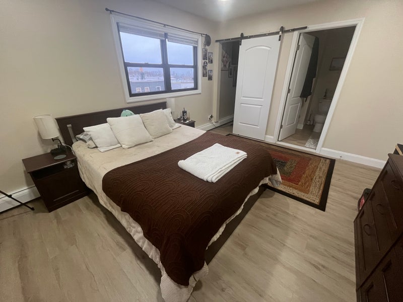 Private Bedroom + Private Bathroom – 15 Minutes to NYC Spacious private bedroom with your own private bathroom available in a furnished apartment just 15 minutes from the city. Conveniently located directly across from a park, with a bus stop to NYC just half a block away. Street parking is easily accessible across the street. The apartment includes: • Huge walk-in closet • In-unit washer & dryer • Dishwasher • Shared fridge • Working gas stove & oven • Backyard access • Communal living room, kitchen, and office/workspace Two cats currently live here (no additional pets allowed). Great setup for someone looking for an easy commute and comfortable shared living space in a well-equipped home. New appliances. Couples welcome. In person or online tours available.